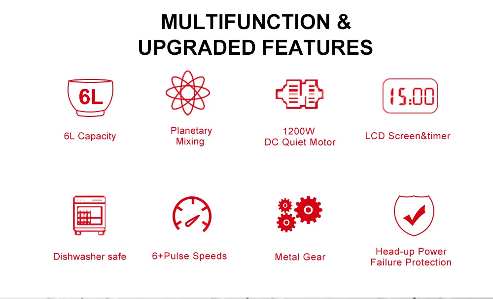 【1200W Powerful DC Motor & Accurate 6 + P Speed Control】The BioloMix 6L stand mixer uses a max 1200W high-end pure copper DC quiet motor with high operating efficiency, equipped with hall sensors and additional pulse settings. 6 optimized speeds with timer function easily knead doughs, thick batters, meringues and whipped cream.