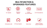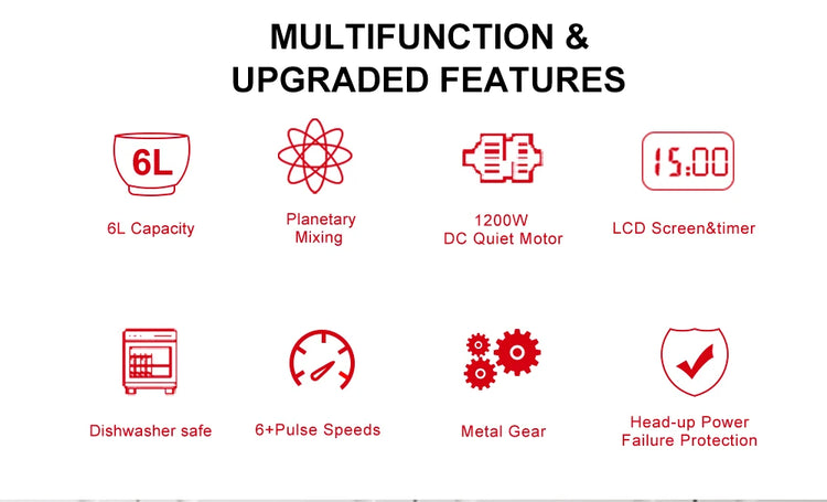 【6L Large Capacity】 BioloMix is equipped with a 6L food-grade stainless steel bowl with dual handles which are more convenient to hold. which can efficiently accommodate family gatherings of 8-10 people. With all metal hardened wire whisk and oversized Teflon coating dough hook, flat beater . Dishwasher safe.