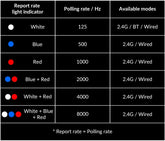 Press the Report Rate button to switch among 6 levels of polling rate from 125 Hz to 8000 Hz in the 2.4 GHz / Wired mode.