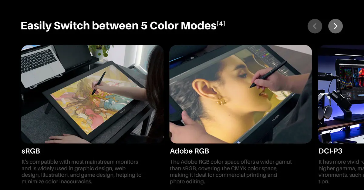 Switch between multiple color modes to match your workflow—from web design to professional-grade video production.