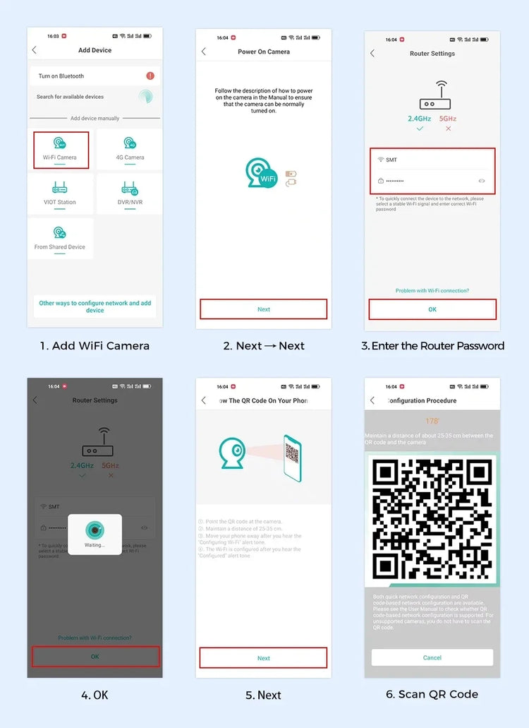 ③ Connect the camera through the 2.4Ghz Wifi network band, follow the 6 steps in the picture to connect, and you can configure it successfully.